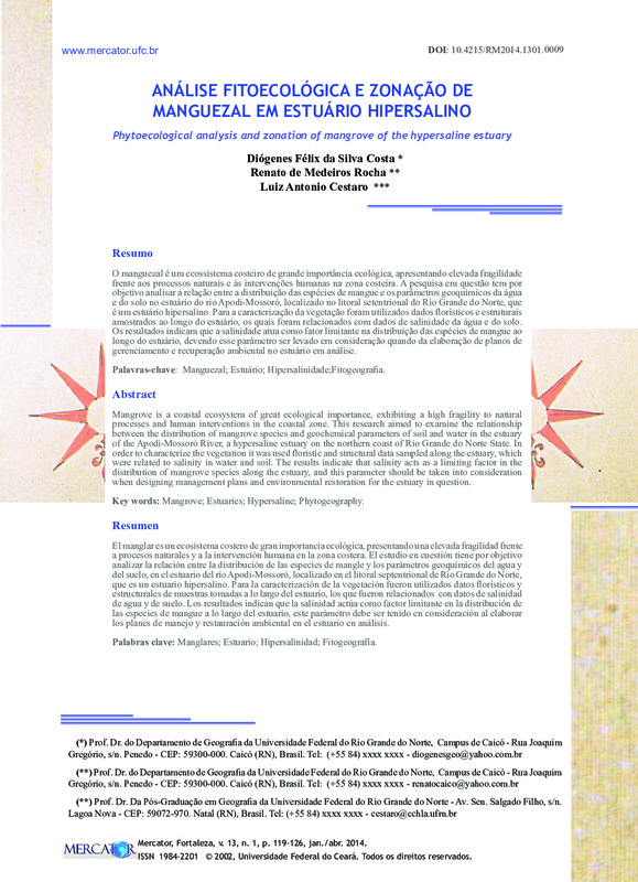 ANÁLISE FITOECOLÓGICA E ZONAÇÃO DE MANGUEZAL EM ESTUÁRIO HIPERSALINO (Phytoecological analysis and zonation of mangrove of the hypersaline estuary )