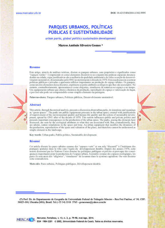 PARQUES URBANOS, POLÍTICAS PÚBLICAS E SUSTENTABILIDADE (urban parks, global politics sustainable development)