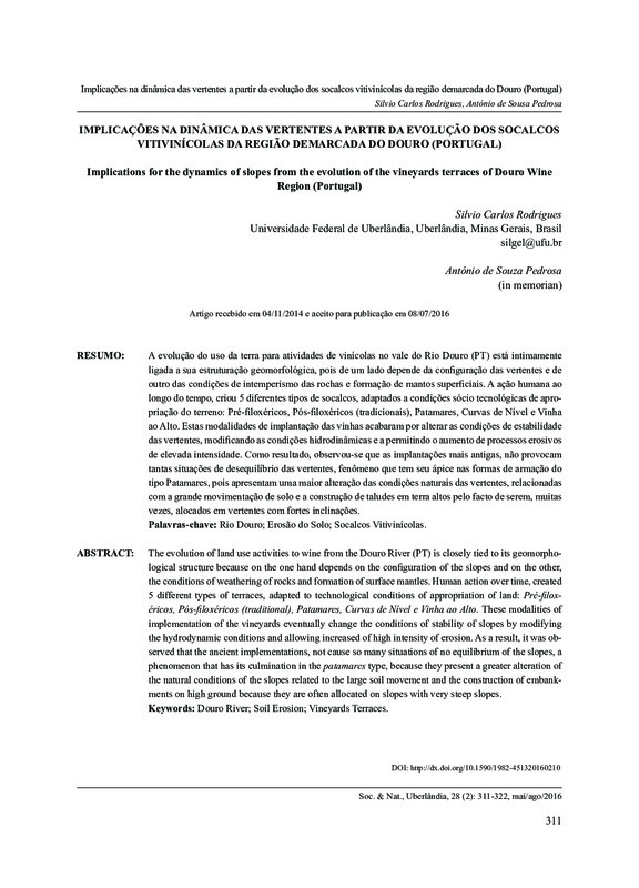 A evolução do uso da terra para atividades de vitícolas no vale do Rio Douro (PT) está intimamente ligada a sua estruturação geomorfológica, pois de um lado depende da configuração das vertentes e de outro das condições de intemperismo das rochas e formação de mantos superficiais. A ação humana ao longo do tempo, criou 5 diferentes tipos de socalcos, adaptados a condições sócio tecnológicas de apropriação do terreno: Pré-filoxéricos, Pós-filoxéricos (tradicionais), Patamares, Curvas de Nível e Vinha ao Alto. Estas modalidades de implantação das vinhas acabaram por alterar as condições de estabilidade das vertentes, modificando as condições hidrodinâmicas e a permitindo o aumento de processos erosivos de elevada intensidade. Como resultado, observou-se que as implantações mais antigas, não provocam tantas situações de desequilíbrio das vertentes, fenômeno que tem seu ápice nas formas de armação do tipo Patamares, pois apresentam uma maior alteração das condições naturais das vertentes, relacionadas com a grande movimentação de solo e a construção de taludes em terra altos pelo facto de serem, muitas vezes, alocados em vertentes com fortes inclinações.