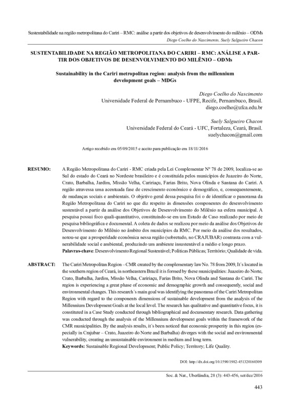 A Região Metropolitana do Cariri - RMC criada pela Lei Complementar Nº 78 de 2009, localiza-se ao Sul do estado do Ceará no Nordeste brasileiro e é constituída pelos municípios de Juazeiro do Norte, Crato, Barbalha, Jardim, Missão Velha, Caririaçu, Farias Brito, Nova Olinda e Santana do Cariri. A região atravessa uma acentuada fase de crescimento econômico e demográfico, e, consequentemente, de mudanças sociais e ambientais. O objetivo geral dessa pesquisa foi o de identificar o panorama da Região Metropolitana do Cariri no que diz respeito às dimensões componentes do desenvolvimento sustentável a partir da análise dos Objetivos de Desenvolvimento do Milênio na esfera municipal. A pesquisa possui foco quali-quantitativo, constituindo-se em um Estudo de Caso realizado por meio de pesquisa bibliográfica e documental. A coleta de dados se realizou por meio da análise dos Objetivos de Desenvolvimento do Milênio no âmbito dos municípios da RMC. Por meio da análise dos resultados, notou-se que a prosperidade econômica nessa região (sobretudo, no CRAJUBAR) contrasta com a vulnerabilidade social e ambiental, produzindo um ambiente insustentável a médio e longo prazo.