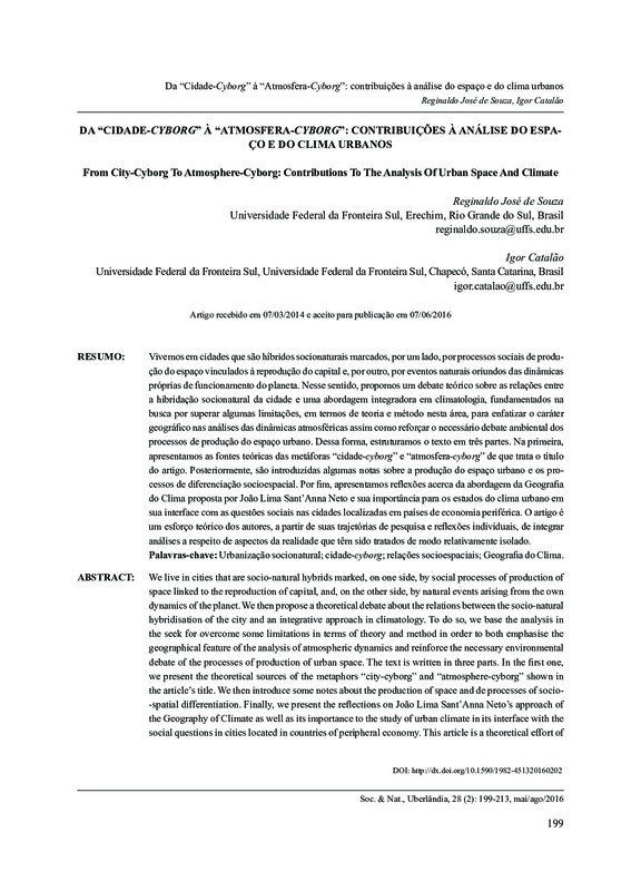 Vivemos em cidades que são híbridos socionaturais marcados, por um lado, por processos sociais de produção do espaço vinculados à reprodução do capital e, por outro, por eventos naturais oriundos das dinâmicas próprias de funcionamento do planeta. Nesse sentido, propomos um debate teórico sobre as relações entre a hibridação socionatural da cidade e uma abordagem integradora em climatologia, fundamentados na busca por superar algumas limitações, em termos de teoria e método nesta área, para enfatizar o caráter geográfico nas análises das dinâmicas atmosféricas assim como reforçar o necessário debate ambiental dos processos de produção do espaço urbano. Dessa forma, estruturamos o texto em três partes. Na primeira, apresentamos as fontes teóricas das metáforas “cidade-cyborg” e “atmosfera-cyborg” de que trata o título do artigo. Posteriormente, são introduzidas algumas notas sobre a produção do espaço urbano e os processos de diferenciação socioespacial. Por fim, apresentamos reflexões acerca da abordagem da Geografia do Clima proposta por João Lima Sant’Anna Neto e sua importância para os estudos do clima urbano em sua interface com as questões sociais nas cidades localizadas em países de economia periférica. O artigo é um esforço teórico dos autores, a partir de suas trajetórias de pesquisa e reflexões individuais, de integrar análises a respeito de aspectos da realidade que têm sido tratados de modo relativamente isolado.