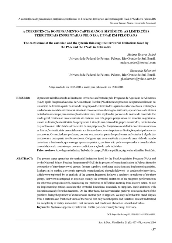A coexistência do pensamento cartesiano e sistêmico: as limitações territoriais enfrentadas pelo PAA e PNAE em Pelotas/RS / The coexistence of the cartesian and the sytemic thinking: the territorial limitations faced by the PAA and the PNAE in Pelotas/RS