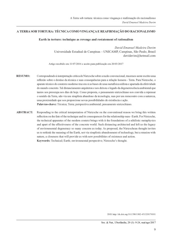 Correspondendo à interpretação critica de Nietzsche sobre a razão convencional, trazemos neste escrito uma reflexão sobre o destino da técnica e suas consequências para a relação homem - terra. Para Nietzsche, o aparato técnico do contexto moderno traz em si as bases de uma metafísica niilista e apartada da efetividade do mundo concreto. Tal distanciamento arquitetou e nos deixou o legado da degenerescência ambiental que tantos nos preocupam nos dias de hoje. Como proposta, o pensamento nietzschiano nos convida a repensar o sentido da terra, não via um simplista abandono da tecnologia, mas por um reencontro com a natureza, uma proximidade que nos proporcione novas possibilidades de existência e agir.