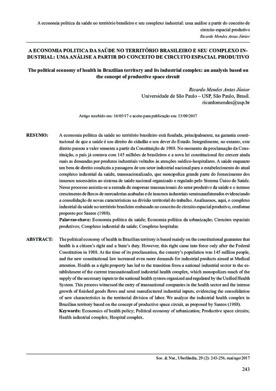 A economia política da saúde no território brasileiro está fundada, principalmente, na garantia constitucional de que a saúde é um direito do cidadão e um dever do Estado. Integralmente, no entanto, este direito passou a valer somente a partir da Constituição de 1988. No momento da proclamação da Constituição, o país já contava com 145 milhões de brasileiros e a nova lei constitucional fez crescer ainda mais as demandas por produtos industriais voltados às atenções médico-hospitalares. A saúde enquanto um bem de direito conduziu a passagem de um setor industrial nacional para o estabelecimento do atual complexo industrial da saúde, transnacionalizado, que monopoliza grande parte do fornecimento dos insumos necessários ao sistema de saúde nacional organizado e regulado pelo Sistema Único de Saúde. Nesse processo assistiu-se a entrada de empresas transnacionais do setor produtivo da saúde e o intenso crescimento de fluxos de mercadorias acabadas e de insumos industriais semimanufaturados evidenciando a consolidação de novas características na divisão territorial do trabalho. Analisamos, aqui, o complexo industrial da saúde no território brasileiro embasado no conceito de circuito espacial produtivo, conforme proposto por Santos (1988).