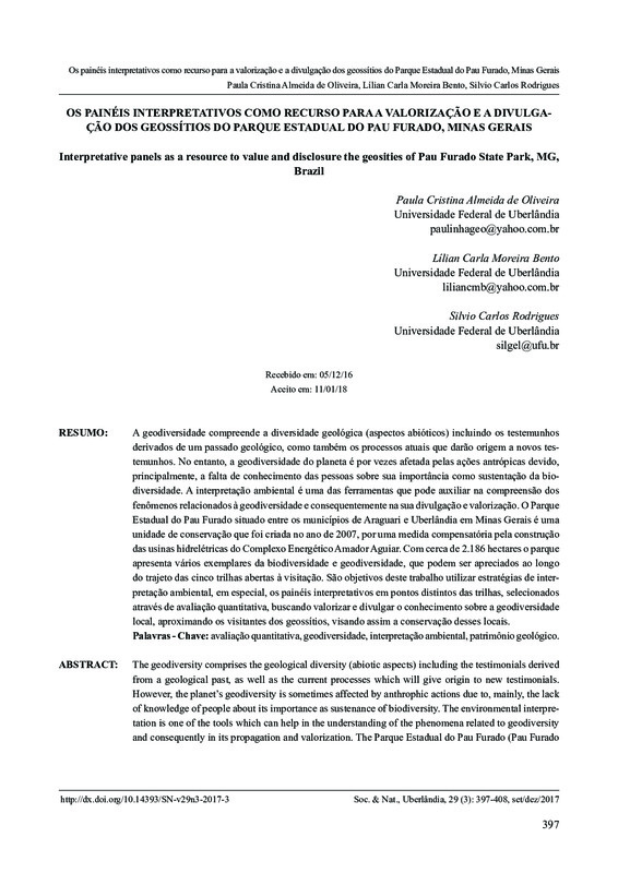 A geodiversidade compreende a diversidade geológica (aspectos abióticos) incluindo os testemunhos derivados de um passado geológico, como também os processos atuais que darão origem a novos testemunhos. No entanto, a geodiversidade do planeta é por vezes afetada pelas ações antrópicas devido, principalmente, a falta de conhecimento das pessoas sobre sua importância como sustentação da biodiversidade. A interpretação ambiental é uma das ferramentas que pode auxiliar na compreensão dos fenômenos relacionados à geodiversidade e consequentemente na sua divulgação e valorização. O Parque Estadual do Pau Furado situado entre os municípios de Araguari e Uberlândia em Minas Gerais é uma unidade de conservação que foi criada no ano de 2007, por uma medida compensatória pela construção das usinas hidrelétricas do Complexo Energético Amador Aguiar. Com cerca de 2.186 hectares o parque apresenta vários exemplares da biodiversidade e geodiversidade, que podem ser apreciados ao longo do trajeto das cinco trilhas abertas à visitação. São objetivos deste trabalho utilizar estratégias de interpretação ambiental, em especial, os painéis interpretativos em pontos distintos das trilhas do parque, como instrumentos de valorização e divulgação dos geossítios, com intuito de disseminar o conhecimento sobre a geodiversidade, contribuir com a interpretação e a sensibilização do patrimônio geológico da unidade de conservação, fazendo com que o público visitante da se aproxime geodiversidade da região e dessa forma, proteja os geossítios.
