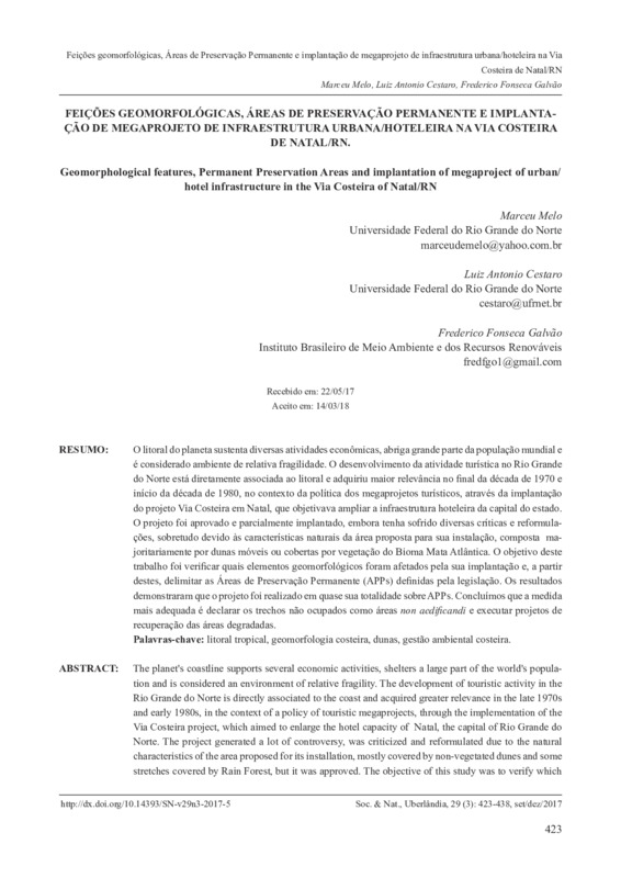 O litoral do planeta sustenta diversas atividades econômicas, abriga grande parte da população mundial e é considerado ambiente de relativa fragilidade. O desenvolvimento da atividade turística no Rio Grande do Norte está diretamente associada ao litoral e adquiriu maior relevância no final da década de 1970 e início da década de 1980, no contexto da política dos megaprojetos turísticos, através da implantação do projeto Via Costeira em Natal, que objetivava ampliar a infraestrutura hoteleira da capital do estado. O projeto foi aprovado e parcialmente implantado, embora tenha sofrido diversas críticas e reformulações, sobretudo devido às características naturais da área proposta para sua instalação, composta majoritariamente por dunas móveis ou cobertas por vegetação do Bioma Mata Atlântica. O objetivo deste trabalho foi verificar quais elementos geomorfológicos foram afetados pela sua implantação e, a partir destes, delimitar as Áreas de Preservação Permanente (APPs) definidas pela legislação. Os resultados demonstraram que o projeto foi realizado em quase sua totalidade sobre APPs. Concluímos que a medida mais adequada é declarar os trechos não ocupados como áreas non aedificandi e executar projetos de recuperação das áreas degradadas.