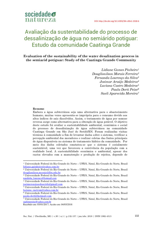 SUSTENTABILIDADE DO PROCESSO DE DESSALINIZAÇÃO DE ÁGUA NO SEMIÁRIDO POTIGUAR: ESTUDO DA COMUNIDADE CAATINGA GRANDE