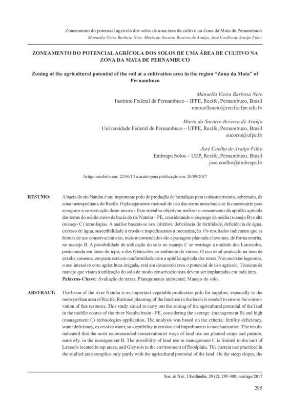 A bacia do rio Natuba é um importante polo de produção de hortaliças para o abastecimento, sobretudo, da zona metropolitana do Recife. O planejamento racional do uso das terras nesta bacia se faz necessário para assegurar a conservação deste recurso. Este trabalho objetivou realizar o zoneamento da aptidão agrícola das terras do médio curso da bacia do rio Natuba – PE, considerando o emprego da média (manejo B) e alta (manejo C) tecnologias. A análise baseou-se nos critérios: deficiência de fertilidade, deficiência de água, excesso de água, suscetibilidade à erosão e impedimentos à mecanização. Os resultados indicaram que as formas de uso conservacionistas, mais recomendados são a pastagem plantada e lavouras, de forma restrita, no manejo B. A possibilidade de utilização do solo no manejo C se restringe à unidade dos Latossolos, posicionada em áreas de topo, e dos Gleissolos no ambiente de várzea. O uso atual praticado na área de estudo, somente, em parte está em conformidade com a aptidão agrícola das terras. Nas encostas íngremes, o uso intensivo com agricultura irrigada, está em desacordo com o potencial de uso agrícola. Técnicas de manejo que visam à utilização do solo de modo conservacionista devem ser implantadas em toda área.