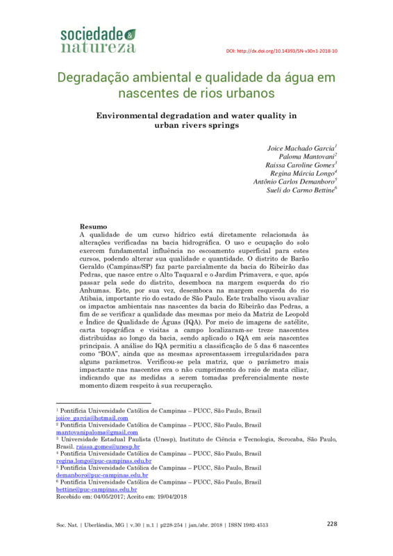 A qualidade de um curso hídrico está diretamente relacionada às alterações verificadas na bacia hidrográfica. O uso e ocupação do solo exercem fundamental influência no escoamento superficial para estes cursos, podendo alterar sua qualidade e quantidade. O distrito de Barão Geraldo (Campinas/SP) faz parte parcialmente da bacia do Ribeirão das Pedras, que nasce entre o Alto Taquaral e o Jardim Primavera, e que, após passar pela sede do distrito, desemboca na margem esquerda do rio Anhumas. Este, por sua vez, desemboca na margem esquerda do rio Atibaia, importante rio do estado de São Paulo. Este trabalho visou avaliar os impactos ambientais nas nascentes da bacia do Ribeirão das Pedras, a fim de se verificar a qualidade das mesmas por meio da Matriz de Leopold e Índice de Qualidade de Águas (IQA). Por meio de imagens de satélite, carta topográfica e visitas a campo localizaram-se treze nascentes distribuidas ao longo da bacia, sendo aplicado o IQA em seis nascentes principais. A análise do IQA permitiu a classificação de 5 das 6 nascentes como “BOA”, ainda que as mesmas apresentassem irregularidades para alguns parâmetros. Verificou-se pela matriz, que o parâmetro mais impactante nas nascentes era o não cumprimento do raio de mata ciliar, indicando que as medidas a serem tomadas preferencialmente neste momento dizem respeito à sua recuperação.