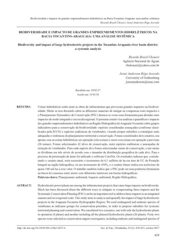 Usinas hidrelétricas estão entre as obras de infraestrutura que provocam grandes impactos na biodiversidade. Muito se tem discutido sobre as diferentes maneiras de mitigar ou compensar estes impactos e o Planejamento Sistemático de Conservação (PSC) destaca-se como uma ferramenta para abordar estes impactos de modo integrado e em escala regional. O presente estudo visa analisar e quantificar o impacto dos grandes empreendimentos hidrelétricos na Região Hidrográfica do Araguaia-Tocantins sobre grupos indicadores para a conservação da biodiversidade: espécies ameaçadas e espécies endêmicas de vertebrados, visando propor subsídios a estratégias mais adequadas e sistêmicas de planejamento territorial e conservação. Foram considerados dois cenários, um apenas com as usinas hidrelétricas em operação (oito usinas) e outro com usinas em operação e previstas (26 usinas). Foram selecionados 42 alvos de conservação, entre espécies endêmicas e ameaçadas de extinção de vertebrados. Para cada espécie alvo foram selecionadas metas de conservação, e tais metas se dividiram em três níveis de acordo com o tamanho da distribuição geográfica de cada alvo. Para o processo de priorização de áreas foi utilizado o software ConsNet. Os resultados indicam que, considerando o cenário atual, seria necessário o incremento de 6,1 milhões de ha em área de UC de Proteção Integral na bacia, ou um incremento de 450%, e o cenário futuro indica um acréscimo de quase 100 mil ha a esse valor. O trabalho também indica que o PSC pode ser uma poderosa ferramenta na busca do consenso entre atores com diferentes interesses nas bacias hidrográficas.