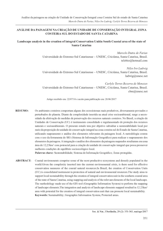 Análise da paisagem na criação de Unidade de Conservação Integral zona Costeira Sul do estado de Santa Catarina / Landscape analysis in the creation of integral Conservation Unitin South Coastal area of the state of Santa Catarina