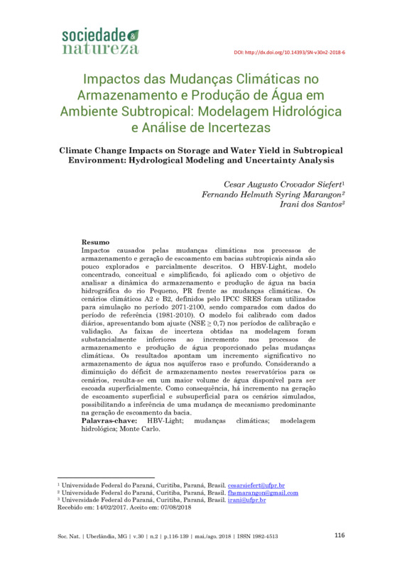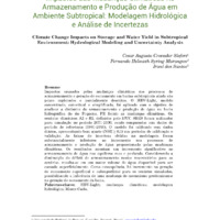Impactos causados pelas mudanças climáticas nos processos de armazenamento e geração de escoamento em bacias subtropicais ainda são pouco explorados e parcialmente descritos. O HBV-Light, modelo concentrado, conceitual e simplificado, foi aplicado com o objetivo de analisar a dinâmica do armazenamento e produção de água na bacia hidrográfica do rio Pequeno, PR frente as mudanças climáticas. Os cenários climáticos A2 e B2, definidos pelo IPCC SRES foram utilizados para simulação no período 2071-2100, sendo comparados com dados do período de referência (1981-2010). O modelo foi calibrado com dados diários, apresentando bom ajuste (NSE ≥ 0,7) nos períodos de calibração e validação. As faixas de incerteza obtidas na modelagem foram substancialmente inferiores ao incremento nos processos de armazenamento e produção de água proporcionado pelas mudanças climáticas. Os resultados apontam um incremento significativo no armazenamento de água nos aquíferos raso e profundo. Considerando a diminuição do déficit de armazenamento nestes reservatórios para os cenários, resulta-se em um maior volume de água disponível para ser escoada superficialmente. Como consequência, há incremento na geração de escoamento superficial e subsuperficial para os cenários simulados, possibilitando a inferência de uma mudança de mecanismo predominante na geração de escoamento da bacia.