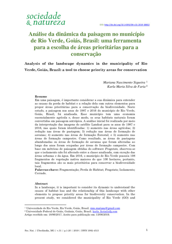 Análise da dinâmica da paisagem no município de Rio Verde, Goiás, Brasil: uma ferramenta para a escolha de áreas prioritárias para a conservação