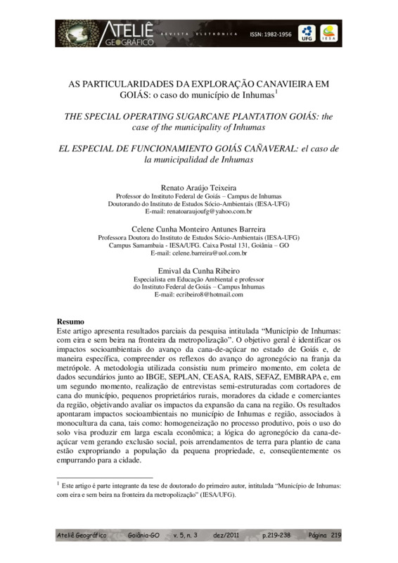 Este artigo apresenta resultados parciais da pesquisa intitulada “Município de Inhumas: com eira e sem beira na fronteira da metropolização”. O objetivo geral é identificar os impactos socioambientais do avanço da cana-de-açúcar no estado de Goiás e, de maneira específica, compreender os reflexos do avanço do agronegócio na franja da metrópole. A metodologia utilizada consistiu num primeiro momento, em coleta de dados secundários junto ao IBGE, SEPLAN, CEASA, RAIS, SEFAZ, EMBRAPA e, em um segundo momento, realização de entrevistas semi-estruturadas com cortadores de cana do município, pequenos proprietários rurais, moradores da cidade e comerciantes da região, objetivando avaliar os impactos da expansão da cana na região. Os resultados apontaram impactos socioambientais no município de Inhumas e região, associados à monocultura da cana, tais como: homogeneização no processo produtivo, pois o uso do solo visa produzir em larga escala econômica; a lógica do agronegócio da cana-de-açúcar vem gerando exclusão social, pois arrendamentos de terra para plantio de cana estão expropriando a população da pequena propriedade, e, conseqüentemente os empurrando para a cidade.