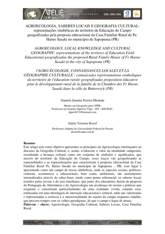 Agroecologia, saberes locais e Geografia Cultural: representações simbólicas do território da Educação do Campo geografizadas pela proposta educacional da Casa Familiar Rural de Pe. Haruo Sasaki no município de Sapopema (PR) - DOI 10.5216/ag.v5i2.15514