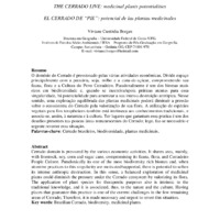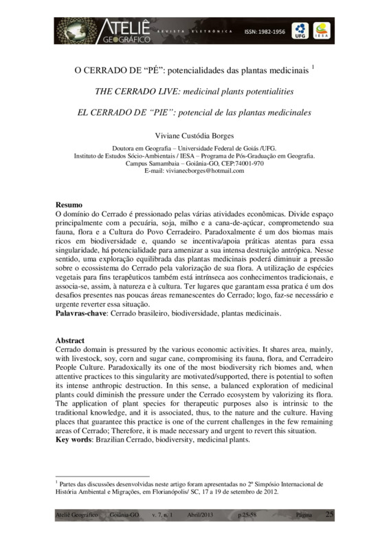 Resumo O domínio do Cerrado é pressionado pelas várias atividades econômicas. Divide espaço principalmente com a pecuária, soja, milho e a cana-de-açúcar, comprometendo sua fauna, flora e a Cultura do Povo Cerradeiro. Paradoxalmente é um dos biomas mais ricos em biodiversidade e, quando se incentiva/apoia práticas atentas para essa singularidade, há potencialidade para amenizar a sua intensa destruição antrópica. Nesse sentido, uma exploração equilibrada das plantas medicinais poderá diminuir a pressão sobre o ecossistema do Cerrado pela valorização de sua flora. A utilização de espécies vegetais para fins terapêuticos também está intrínseca aos conhecimentos tradicionais, e associa-se, assim, à natureza e à cultura. Ter lugares que garantam essa pratica é um dos desafios presentes nas poucas áreas remanescentes do Cerrado; logo, faz-se necessário e urgente reverter essa situação. Abstract Cerrado domain is pressured by the various economic activities. It shares area, mainly, with livestock, soy, corn and sugar cane, compromising its fauna, flora, and Cerradeiro People Culture. Paradoxically its one of the most biodiversity rich biomes and, when attentive practices to this singularity are motivated/supported, there is potential to soften its intense anthropic destruction. In this sense, a balanced exploration of medicinal plants could diminish the pressure under the Cerrado ecosystem by valorizing its flora. The application of plant species for therapeutic purposes also is intrinsic to the traditional knowledge, and it is associated, thus, to the nature and the culture. Having places that guarantee this practice is one of the current challenges in the few remaining areas of Cerrado; Therefore, it is made necessary and urgent to revert this situation. Key words: Brazilian Cerrado, biodiversity, medicinal plants. Resumen El área del Cerrado es presionada por las diversas actividades económicas. Divide el espacio, especialmente con el ganado, soja, maíz y caña de azúcar, poniendo en peligro su flora, fauna y cultura del Pueblo Cerradero. Paradójicamente, es uno de los biomas más ricos en biodiversidad, y con incentivo/apoyo a las prácticas de atención a esta singularidad, existe la posibilidad de aliviar su destrucción antrópica intensa. En este sentido, una explotación equilibrada de las plantas medicinales puede reducir la presión sobre el ecosistema del Cerrado por la apreciación de su flora. El uso de especies de plantas con fines terapéuticos también está intrínseco en los conocimientos tradicionales y de esta manera se unen la naturaleza y la cultura. Haber lugares para asegurar esta práctica es uno de los desafíos presentes en las pocas áreas del Cerrado, por eso es necesario y urgente revertir esta situación. Palabras clave: Cerrado de Brasil, la biodiversidad y las plantas medicinales.