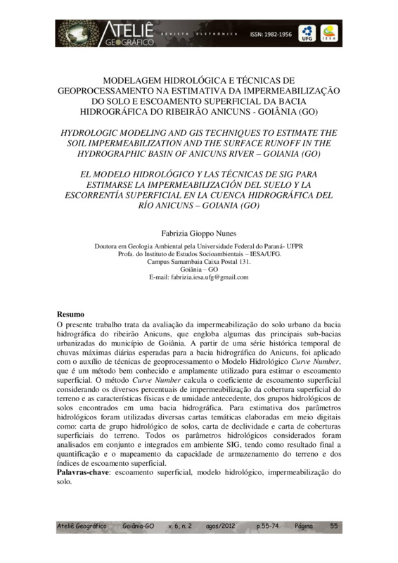 O presente trabalho trata da avaliação da impermeabilização do solo urbano da bacia hidrográfica do ribeirão Anicuns, que engloba algumas das principais sub-bacias urbanizadas do município de Goiânia. A partir de uma série histórica temporal de chuvas máximas diárias esperadas para a bacia hidrográfica do Anicuns, foi aplicado com o auxílio de técnicas de geoprocessamento o Modelo Hidrológico Curve Number, que é um método bem conhecido e amplamente utilizado para estimar o escoamento superficial. Com o método Curve Number se calcula o coeficiente de escoamento superficial a partir dos diversos percentuais de impermeabilização da cobertura superficial do terreno e das características físicas e umidade antecedente, dos grupos hidrológicos de solos encontrados em uma bacia hidrográfica. Para estimativa dos parâmetros hidrológicos foram utilizadas diversas cartas temáticas elaboradas em meio digitais como: carta de grupo hidrológico de solos, carta de declividade e carta de coberturas superficiais do terreno. Todos os parâmetros hidrológicos considerados foram analisados em conjunto e integrados em ambiente SIG, tendo como resultado final a quantificação e o mapeamento da capacidade de armazenamento do terreno e dos índices de escoamento superficial.