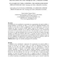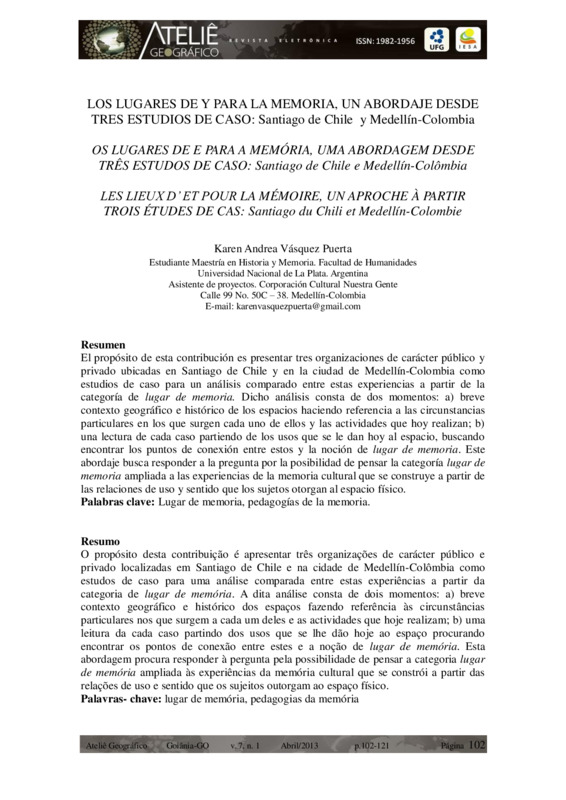 Resumen El propósito de esta contribución es presentar tres organizaciones de carácter público y privado ubicadas en Santiago de Chile y en la ciudad de Medellín-Colombia como estudios de caso para un análisis comparado entre estas experiencias a partir de la categoría de lugar de memoria. Dicho análisis consta de dos momentos: a) breve contexto geográfico e histórico de los espacios haciendo referencia a las circunstancias particulares en los que surgen cada uno de ellos y las actividades que hoy realizan; b) una lectura de cada caso partiendo de los usos que se le dan hoy al espacio, buscando encontrar los puntos de conexión entre estos y la noción de lugar de memoria. Este abordaje busca responder a la pregunta por la posibilidad de pensar la categoría lugar de memoria ampliada a las experiencias de la memoria cultural que se construye a partir de las relaciones de uso y sentido que los sujetos otorgan al espacio físico. . Resumo O propósito desta contribuição é apresentar três organizações de carácter público e privado localizadas em Santiago de Chile e na cidade de Medellín-Colômbia como estudos de caso para uma análise comparada entre estas experiências a partir da categoria de lugar de memória. A dita análise consta de dois momentos: a) breve contexto geográfico e histórico dos espaços fazendo referência às circunstâncias particulares nos que surgem a cada um deles e as actividades que hoje realizam; b) uma leitura da cada caso partindo dos usos que se lhe dão hoje ao espaço procurando encontrar os pontos de conexão entre estes e a noção de lugar de memória. Esta abordagem procura responder à pergunta pela possibilidade de pensar a categoria lugar de memória ampliada às experiências da memória cultural que se constrói a partir das relações de uso e sentido que os sujeitos outorgam ao espaço físico. Palavras- chave: lugar de memória, pedagogias da memória Résumé L’intention de ce texte c'est présenter le travail de trois organisations publiques et privées à Medellín (Colombie) et à Santiago (Chili), servant comme étude de cas afin d’élaborer une analyse comparative entre leurs expériences à partir la catégorie “lieu de la mémoire”. Cet étude comporte deux volets: a) la présentation d’un contexte géographique et historique des espaces en remarquant les circonstances particulières où ces organisations ont fait son apparition et les activités qui s’y réalisent actuellement; b) une lecture de chaque cas dont son répère sera l’usage atuel de l’espace, cela dans le but de retrouver les rapports entre ces cas-ci et le concept de lieu de mémoire. Cet aproche essaie de répondre à la demande pour la possibilité de penser à la catégorie de lieu de mémoire liée aux expériences de la mémoire culturelle, construite selon les rélations d’utilisation et de sens données pour les sujets à l’espace. Mots clefs: lieu de la mémoire, pedagogías de la mémoire