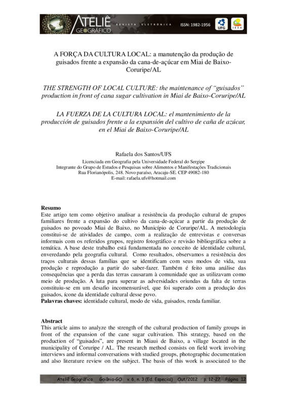 Este artigo tem como objetivo analisar a resistência da produção cultural de grupos familiares frente a expansão do cultivo da cana-de-açúcar a partir da produção de guisados no povoado Miai de Baixo, no Município de Coruripe/AL. A metodologia constitui-se de atividades de campo, com a realização de entrevistas e conversas informais com os referidos grupos, registro fotográfico e revisão bibliográfica sobre a temática. A base deste trabalho está fundamentada no conceito de identidade cultural, enveredando pela geografia cultural. Como resultados, observamos a resistência dos traços culturais dessas famílias que se identificam com seus modos de vida, sua produção e reprodução a partir do saber-fazer. Também é feito uma análise das consequências que a perda das terras causaram à comunidade que as utilizavam como meio de produção. A luta para superar as adversidades oriundas da falta de terras constituiu-se em um desafio incomensurável, que foi superado com a produção dos guisados, ícone da identidade cultural desse povo.