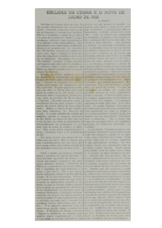 - Euclides da Cunha e o nove de julho de 1932. Lamenta que a Revolução Paulista não tenha, também, um Euclides