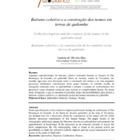 Resumo Algumas especificidades do batismo coletivo realizado durante os festejos de São Domingos de Gusmão, no quilombo Barra de Aroeira, estado do Tocantins, são trazidas aqui para uma discussão sobre a construção dos nomes e da vida enquanto processos identitários constituintes deste grupo humano. O trabalho resulta de etnografia realizada entre os quilombolas e propõe a tomada de conhecimento dos processos como elemento essencial para acessar as complexidades locais. De posse desta etnografia, o que se encontra no presente artigo são possibilidades para pensar o batismo católico coletivo e a construção social dos nomes em terras de quilombo. Palavras-Chave: Quilombos; Batismo; Festejos; Nomes. Abstract Some specifications of the collective baptism performed during the celebration of São Domingos de Gusmão, in the Barra de Aroeira quilombo, in the state of Tocantins, are brought here for a discussion about the construction of the names and life while identify processes constituents of this human beings. The paper results of the ethnography performed among the Maroons (known as quilombolas) and proposes the apprehension of knowledge of the processes as an essential element to access the local complexities. By this ethnography, what is found in the present article are possibilities to think the collective catholic baptism and the social construction of the names in the lands of Quilombo. Keywords: Quilombos; Baptism; Celebration; Names. Resumen Algunos aspectos específicos del bautismo colectivo realizado durante las fiestas patronales de Santo Domingos de Gusmão, en el Quilombo Barra de Aroeira, ubicada en la Provincia de Tocantins, son presentados aquí para que tengamos una discusión de la construcción de los nombres, y de la vida, como constituyentes de estos procesos de identidad de este grupo humano. El trabajo resulta de la etnografía entre las gentes de los quilombos y propone investigar sus procesos sociales como elemento sin los cuales no puede uno conocer a las complejidades locales. La etnografía presente en este artículo trae posibilidades para pensar el bautismo católico y la construcción social de los nombres colectivos en las tierras de quilombo.
