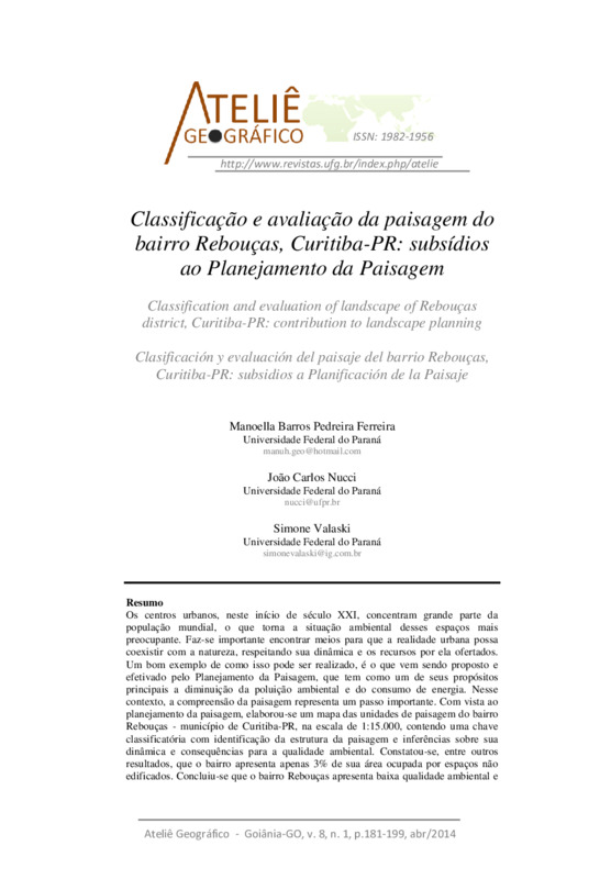 Resumo Os centros urbanos, neste início de século XXI, concentram grande parte da população mundial, o que torna a situação ambiental desses espaços mais preocupante. Faz-se importante encontrar meios para que a realidade urbana possa coexistir com a natureza, respeitando sua dinâmica e os recursos por ela ofertados. Um bom exemplo de como isso pode ser realizado, é o que vem sendo proposto e efetivado pelo Planejamento da Paisagem, que tem como um de seus propósitos principais a diminuição da poluição ambiental e do consumo de energia. Nesse contexto, a compreensão da paisagem representa um passo importante. Com vista ao planejamento da paisagem, elaborou-se um mapa das unidades de paisagem do bairro Rebouças - município de Curitiba-PR, na escala de 1:15.000, contendo uma chave classificatória com identificação da estrutura da paisagem e inferências sobre sua dinâmica e consequências para a qualidade ambiental. Constatou-se, entre outros resultados, que o bairro apresenta apenas 3% de sua área ocupada por espaços não edificados. Concluiu-se que o bairro Rebouças apresenta baixa qualidade ambiental e que o método aplicado é de grande importância para a compreensão, inclusive para leigos, da estrutura e do funcionamento das paisagens urbanizadas. Abstract Urban centers in the beginning of XXI century concentrate a large portion of the world population which makes the environmental situation of these spaces more worrying. Aiming this issue is important to find ways to make urban reality able to coexist with nature, respecting their dynamics and the resources offered by it. A fine example of how this issue can be accomplished is what has been proposed and executed by Landscape Planning, which has as one of its main purposes the reduction of environmental pollution and energy consumption. Within this context, the understanding of the landscape constitutes an important step. Considering the landscape planning, this paper aims to elaborate a map of landscape units in the Rebouças district located in the Curitiba-PR, on the scale 1:15.000, containing a key classificatory with inferences about the landscape, their structure and dynamics and its consequences for environmental quality. It was noticed, among anothers results, that there is only 3% of the district area ocupaded with non-built up spaces. It was concluded that the Rebouças district has a low environmental quality and the method applied is very important to understanding, including people with little knowledge about the subject, the structure and the dynamic of the urbanized landscapes. Keywords: landscape units, urban planning, urban ecology. Resumen Los centros urbanos, en el inicio del siglo XXI, concentran la mayor parte de la población mundial, lo que hace la situación ambiental en estas áreas más preocupante. Es importante encontrar formas para que la realidad urbana pueda coexistir con la naturaleza, respetando su dinámica y las características ofrecidas por el mismo. Un buen ejemplo de cómo esto se puede lograr es lo que se propone y la efectuada por Planificación del Paisaje, que tiene como uno de sus principales propósitos la reducción de la contaminación ambiental y el consumo de energía. En este contexto, la comprensión del paisaje es un paso importante. Con vistas a la planificación del paisaje, se elaboró un mapa de unidades de paisaje en el barrio Rebouças - municipio de Curitiba-PR, en la escala de 1:15.000, que contiene una clave de clasificación con la identificación de la estructura del paisaje y las inferencias acerca de su dinámica y consecuencias para la calidad del medio ambiente. Se constató, entre otros resultados, que ese barrio presenta solament 3% de su superficie ocupada por los espacios no edificados. Se concluyó, que el barrio Rebouças tiene una baja calidad del medio ambiente y que el método utilizado es de gran importancia para la comprensión, incluso para aquellos que no están familiarizados con el tema, de la estructura y del funcionamiento de los paisajes urbanos. Palabras clave: unidades de paisaje, planificación urbana, ecología urbana.