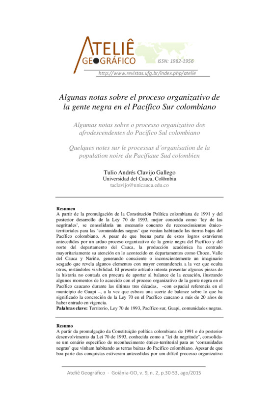Resumen A partir de la promulgación de la Constitución Política colombiana de 1991 y del posterior desarrollo de la Ley 70 de 1993, mejor conocida como ‘ley de las negritudes’, se consolidaría un escenario concreto de reconocimientos étnico-territoriales para las ‘comunidades negras’ que venían habitando las tierras bajas del Pacífico colombiano. A pesar de que buena parte de estos logros estuvieron antecedidos por un arduo proceso organizativo de la gente negra del Pacífico y del norte del departamento del Cauca, la producción académica ha centrado mayoritariamente su atención en lo acontecido en departamentos como Choco, Valle del Cauca y Nariño, generando consciente o inconscientemente un imaginario sesgado que revela algunos elementos con mayor contundencia a la vez que oculta otros, restándoles visibilidad. El presente artículo intenta presentar algunas piezas de la historia no contada en procura de aportar al balance de la ecuación, ilustrando algunos momentos de lo acaecido con el proceso organizativo de la gente negra en el Pacífico caucano durante las últimas tres décadas, –con espacial referencia en el municipio de Guapi –, a la vez que esboza una suerte de balance sobre lo que ha significado la concreción de la Ley 70 en el Pacífico caucano a más de 20 años de haber entrado en vigencia. Palabras clave: Territorio, Ley 70 de 1993, Pacífico sur, Guapi, comunidades negras. Resumo A partir da promulgação da Constituição política colombiana de 1991 e do posterior desenvolvimento da Lei 70 de 1993, conhecida como a "lei da negritude", consolida-se um cenário específico de reconhecimento étnico-territorial para as ‘comunidades negras’ que vinham habitando as terras baixas do Pacífico colombiano. Apesar de que boa parte das conquistas estiveram antecedidas por um difícil processo organizativo das pessoas negras do Pacifico e Norte do departamento de Cauca, a produção acadêmica tem centrado principalmente sua atenção no acontecido em departamentos como Chocó, Valle do Cauca e Nariño, gerando consciente ou inconscientemente, um imaginário distorcido que revela alguns elementos com maior contundência e, por sua vez, oculta outros, restando-lhes visibilidade. Este artigo tenta apresentar algumas peças da história não contada, na tentativa de contribuir com o balanço da equação, ilustrando alguns momentos do acontecido com o processo de organização da população negra no Pacífico caucano durante as últimas três décadas, com referência ao município de Guapi – a sua vez que esboça espécie de balanço sobre o que há significado a concreção da Lei 70 no Pacifico caucano a mais de 20 anos, desde que entrou em vigência. Résumé Dès la promulgation de la Constitution Politique colombienne de 1991 et plus tard de la Loi 70 de 1993, plus connue comme la “Loi des negritudes”, s´est développé puis consolidé tout un mouvement pour la reconnaissance ethnico-territoriale des “communautés noires” qui venaient habiter les basses terres du Pacifique colombien. En dépit du fait qu´une bonne partie de ces avancées aient été précédées par un laborieux processus d´organisation des communautés noires du Pacifique et du Nord du département du Cauca, la production académique a majoritairement concentré son attention sur ce qu´il s´est produit dans les départements comme le Choco, la Valle del Cauca et Nariño. Ceci a alors généré consciemment ou inconsciemment un imaginaire biaisé qui révèle certains éléments avec plus insistance que d´autres, ces derniers alors occultés ou privés d´une meilleure visibilité. Le présent article tente de présenter quelques pièces de l´histoire non contée dans le but de les apporter à l´équilibre de l´équation, illustrant certains éléments survenus au sein du processus d´organisation de la population noire du Pacifique du Cauca durant les trois dernières décennies – avec une référence particulière au municipio de Guapi. Ce qui dans une autre mesure permet de faire une sorte de bilan de ce qu´a signifié la promulgation de la Loi 70 dans la région du Pacifique du Cauca plus de 20 ans après être entrée en vigueur. Mots-clés: Territoire, Loi 70 de 1993, Pacifique sud, Guapi, communautés noires.