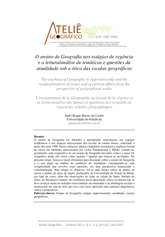 Resumo O ensino de Geografia foi debatido e questionado criticamente nos espaços acadêmicos e nos espaços educacionais das escolas do ensino básico, sobretudo a partir dos anos 1990. Nesse contexto, muitos estagiários assumiram a regência formal de classe em unidades educacionais dos ciclos Fundamental e Médio, criando-se, geralmente, uma expectativa de um ensino de Geografia inovador, crítico e atual. Os estagiários ainda são vistos como aqueles / aquelas que trazem as novidades. No presente artigo, busca-se trazer elementos para discussão sobre o ensino de Geografia e o seu papel na análise de temáticas da atualidade, considerando-se toda complexidade que envolve essas questões, em uma perspectiva transescalar e contextualizada. Para atingir os objetivos, fez-se uma leitura crítica de planos de cursos e planos de aulas de alguns graduandos da Universidade do Estado da Bahia, em final de curso, além das observações de aulas na cidade de Santo Antônio de Jesus, no Recôncavo baiano. Os resultados dessa apreciação crítica revelaram que se deve avançar muito no trabalho com temáticas da atualidade e na abordagem escalar e transescalar em sala de aula, por isso, esse texto apresenta uma natureza diagnóstica, crítica e propositiva. Abstract The teaching of Geography was debated and critically questioned in academic and educational areas of primary schools, especially since the 1990s. In this context, many trainees took over formal teaching apprenticeship at educational units of the elementary and secondary cycles, creating a general expectation of an innovative, critical and current teaching of Geography. Trainees are still perceived as those who bring innovations. In this article, it was sought to provide elements for discussing the teaching of Geography and its role in the analysis of current issues, considering all the complexity involving these issues in a trans-scale and contextualized perspective. In order to achieve the goals, ??a critical reading of course plans and of class plans of some students at State University of Bahia was done at the end of a semester. Yet as part of the data collection, the research counted on classroom participant observation in Santo Antônio de Jesus, in the Bahia’s Reconcavo. The results of these critical appraisals reveal that there is still much teaching development to be achieved in order to approach `current issues` at a scale and trans-scale dimension in the classroom, so this text has a critical, purposeful and diagnostic essence. Keywords: Teaching of Geography; Supervised teaching apprenticeship; Current affairs; Geographical scales. Résumé L´enseignement de la géographie est un sujet de débat et de réflexions critiques dans les domaines académiques et éducationnels, surtout à partir des années 1990. Dans ce contexte, de nombreux stagiaires ont assuré la régence formelle de la classe en unités éducationnelles au niveau des cycles de l´enseignement Primaire et Moyen, en créant, généralement, l´attente d´un enseignement de la Géographie innovateur, critique et actuel. Les stagiaires sont toujours vus comme ceux qui apportent des nouveautés. Dans cet article, on cherchera à apporter des éléments de discussions vis à vis de l´enseignement de la Géographie et son rôle dans l´analyse des thèmes de l´actualité, en considérant toute la complexité que comprennent ces questions, dans une perspective trans-échelle et mise en contexte. Pour atteindre ces objectifs, une lecture critique des plans d´études et de classes de quelques étudiants de premier cycle de l´Université de l´État de Bahia, en fin de formation, a été faite, ajoutée aux observations de classes de la ville de Santo Antonio de Jesus, dans la région du Reconcave bahianais. Les résultats de ces appréciations critiques ont révélé qu´il faudra encore beaucoup avancer dans le travail sur le thème de l´actualité et dans l´abordage de l´échelle et trans-échelle en salle de classe. C´est pour ces raisons que ce texte possède une nature diagnostique, critique et propositive. Mots-clefs: Enseignement de la Géographie; stage supervisionné ; actualité ; échelles géographiques.