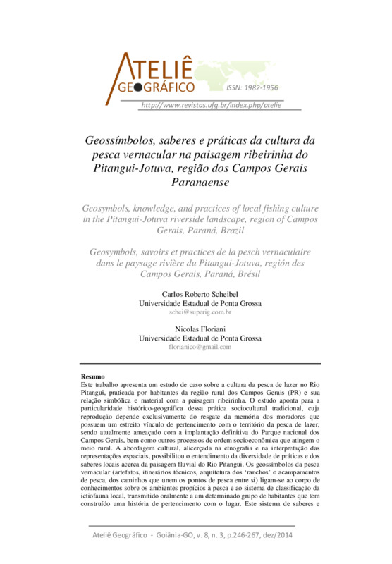 Resumo Este trabalho apresenta um estudo de caso sobre a cultura da pesca de lazer no Rio Pitangui, praticada por habitantes da região rural dos Campos Gerais (PR) e sua relação simbólica e material com a paisagem ribeirinha. O estudo aponta para a particularidade histórico-geográfica dessa prática sociocultural tradicional, cuja reprodução depende exclusivamente do resgate da memória dos moradores que possuem um estreito vínculo de pertencimento com o território da pesca de lazer, sendo atualmente ameaçado com a implantação definitiva do Parque nacional dos Campos Gerais, bem como outros processos de ordem socioeconômica que atingem o meio rural. A abordagem cultural, alicerçada na etnografia e na interpretação das representações espaciais, possibilitou o entendimento da diversidade de práticas e dos saberes locais acerca da paisagem fluvial do Rio Pitangui. Os geossímbolos da pesca vernacular (artefatos, itinerários técnicos, arquitetura dos ‘ranchos’ e acampamentos de pesca, dos caminhos que unem os pontos de pesca entre si) ligam-se ao corpo de conhecimentos sobre os ambientes propícios à pesca e ao sistema de classificação da ictiofauna local, transmitido oralmente a um determinado grupo de habitantes que tem construído uma história de pertencimento com o lugar. Este sistema de saberes e fazeres é cotidianamente ressignificado frente aos fenômenos de urbanização, adaptando-se e apropriando-se também às tecnologias modernas da pesca de lazer. O território da pesca vernacular é permeado por novas territorialidades associadas ao fluxo migratório de turistas provindo do centro urbano nos finais de semana. Abstract This paper presents a study about the knowledge and practices of local fishing culture in the Rio Pitangui landscape, a rural region of Campos Gerais, State of Paraná, Brazil. The study points to historical and geographical particularities of this traditional sociocultural practice, whose reproduction depends solely on the revival of reminiscences of residents who have a close bond of belonging to the territory, currently being threatened by the installation of a National Park, as well as other processes of socioeconomic order which affect rural areas. The cultural approach is done grounded on ethnography and spatial representations, enabled by the understanding of the diversity of practices and of local knowledge about the Rio Pitangui river landscape. The geosymbols of local fishing culture, for example, the artifacts, technical routes, the architecture of fishing stocks and camps, which become paths connecting the points of fishing areas are bonded by the environmental knowledge which includes a system of local icthyofauna classification transmitted orally to a certain group of people who has built a history of belonging to those sites. This system of knowledge and practice is routinely reframed in terms of meanings vis-à-vis the phenomena of urbanization, adapting to and appropriating itself from the modern fishery technologies. The territory of traditional fishing is permeated by new territoriality associated with the flux of tourists coming from the urban centers during the weekends. Keywords: Local fishing culture; Geosymbols; Traditional ecological knowledge; Campos Gerais Region. Resumé Cet article présente une étude de cas sur la culture de la pêche récréative à Rio Pitangui pratiquée par les habitants de la région rurale de Campos Gerais (état du Paraná, Brésil) et sa relatión symbolique et matérielle portant sur le paysage de la rivière . L’étude met en evidence la particularité historique et géographique de cette pratique socioculturelle traditionnelle dont la reproduction dépend de la récupération de la mémoire des résidents qui ont un lien étroit d'appartenance au territoire de la pêche récréative, actuellement menacés pour la creatión du Parc National de Campos Gerais ainsi comme d'autres processus d'ordre socio-économique qui frappent la zone rurale. L'approche culturelle, fondée sur l'ethnographie et l'interprétation des représentations spatiales a permit la compréhension de la diversité des pratiques et des savoirs vernaculaires sur le paysage de la rivière de Rio Pitangui . Les geosymboles de la pêche locale (les artefacts , les itinéraires techniques , l'architecture de « ranchos » et des camps de pêche , les chemins reliant les points de pêche ou les ‘ranchos’) s’attachent à l'ensemble des connaissances sur les environnements pròpres à la pêche ainsi comme sur le niveau du système de classification de la faune locale , transmises oralement à un certain groupe de personnes qui a construit une histoire d'appartenance au paysage. Ce système des pratiques et savoirs locales est régulièrement mit en confrontation par rapport aux phénomènes d'urbanisation et de l’introductión des technologies de la pêche modérne. Le territoire de la pêche vernaculaire est également empreint d’une nouvelle territorialité associée à la migration des touristes qui vienent des centres urbains pendant le week-end. Mots-clés: territoire de la pêche vernaculaire ; geosymboles; savoirs écologiques locaux; Région de Campos Gerais (Brésil).