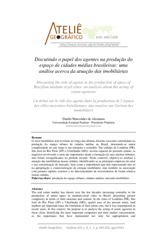 Resumo O setor imobiliário tem revelado ao longo das últimas décadas crescente centralidade na produção do espaço urbano de cidades médias no Brasil, denotando-se maior complexidade no que tange à sua estrutura e conteúdo. Nas cidades de Londrina (PR), São José do Rio Preto (SP) e Uberlândia (MG), recorte espacial do presente estudo, os negócios envolvendo a terra são importantes desde a formação de seus núcleos urbanos, mas foram ressignificados no período recente. Neste contexto, objetiva-se analisar a atuação das imobiliárias nessas cidades, identificando-se as principais empresas do setor e sua concentração de mercado, bem como a importância que têm representado não só na apropriação e comercialização do estoque imobiliário, mas também na associação com grandes capitais externos e no direcionamento de investimentos de forma seletiva nessas cidades. Abstract The real estate market has shown over the last decades increasing centrality in the production of urban space in medium-sized cities in Brazil, presenting greater complexity in terms of their structure and content. In the cities of Londrina (PR), São José do Rio Preto (SP) e Uberlândia (MG), spatial area of the present study, land markets are important since the formation of their urban core, but it was reinterpreted in recent years. In this context, the purpose is to analyze the acting of estate agencies in these cities, identifying the most important companies and their market concentration, as the importance that have represented not only for appropriation and commercialization of real estate stock, but also in association with large foreign capital and direction of selective investments in these cities. Keywords: production of urban space; medium-sized cities; real estate market. Resumé Le secteur immobilier a montré au cours des dernières décennies une croissante centralité dans la production de l’espace urbain des villes moyennes au Brésil, en montrant une majeure complexité par rapport à sa structure et son contenu. Dans les villes de Londrina (PR), São José do Rio Preto (SP) et Uberlândia (MG), le découpage spatiale de cette étude, les affaires impliquant la terre sont importantes depuis la formation de leurs centres urbains, mais ont été remodelés au cours des dernières années. Dans ce contexte, on lance un regard sur le rôle des immobiliers dans ces villes, en identifiant les principales entreprises du secteur et sa concentration sur le marché, ainsi que l’importance qu’elles représentent non seulement dans l’appropriation et commercialisation des foyers, mais aussi dans l’association avec des grands capitaux extérieurs et dans le ciblage des investissements de façon sélectif dans ces villes. Mots-clés: production de l'espace urbain ; villes moyennes ; marché immobilier.