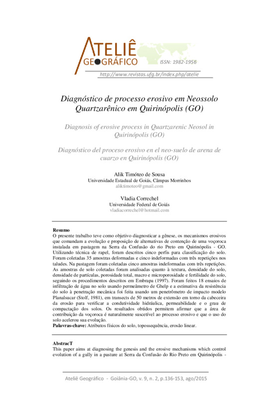 Diagnóstico de processo erosivo em Neossolo Quartzarênico em Quirinópolis (GO) - DOI 10.5216/ag.v9i2.29099