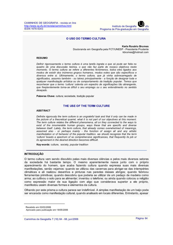 Definir rigorosamente o termo cultura é uma tarefa ingrata e que só pode ser feita no quadro de uma discussão teórica, o que não faz parte de nossos objetivos neste momento. O termo cultura se refere a diferentes fenômenos, todos eles ligados aos modos de existir dos inúmeros grupos humanos, modos estes que são específicos e diversos entre si. Ultimamente, o termo cultura, que já vinha sobrecarregado de significados, assumiu também - ou talvez principalmente - a função de designar toda e qualquer manifestação artística ou de comportamento da tradição popular. Temos que reconhecer que o termo ‘cultura’ ostenta um espectro de significações tão abrangente, que freqüentemente torna-se difícil o seu emprego ou o seu entendimento no sentido desejado.