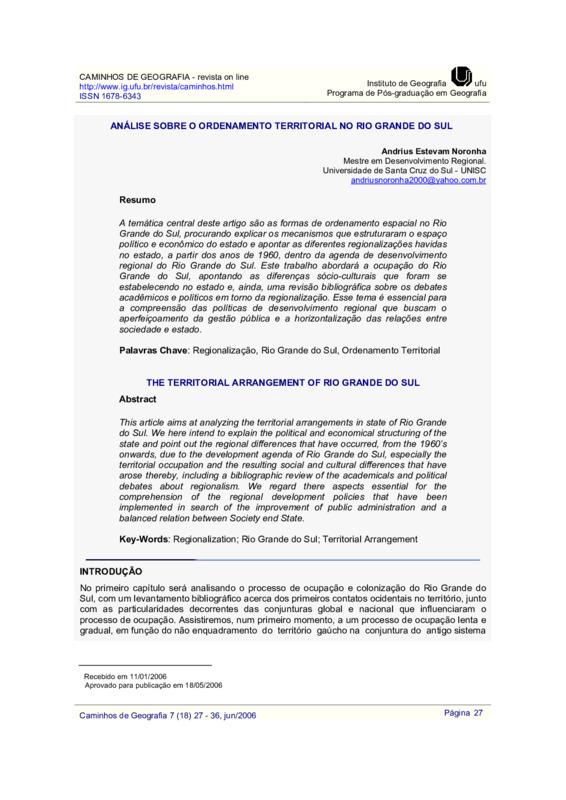 ANÃ?LISE SOBRE O ORDENAMENTO TERRITORIAL NO RIO GRANDE DO SUL / The territorial arrangement of Rio Grande do Sul