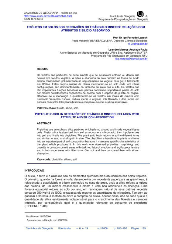Os fitólitos são partículas de silica amorfa que se acumulam entorno ou dentro das células dos tecidos vegetais. A sílica é absorvida do solo primeiro na forma de ácido silícico monomérico polimerizando-se seguidamente no vegetal para gel e finalmente em fitólitos. Estes corpos sólidos da planta incorporam-se ao solo onde tem várias configurações, são dominantemente do tamanho de areia fina e silte. Os fitólitos que têm importantes funções benéficas nas plantas constituem importantes partes do solo por manter características especificas de acordo com a espécie de planta de origem. Observou-se a morfologia e quantificaram-se os fitólitos em locais de cimeira com Latossolo Vermelho Escuro, textura média e argilosa sob Cerrado e dois locais em encosta com solos Glei pouco húmico e comparou-se com o silício assimilável.