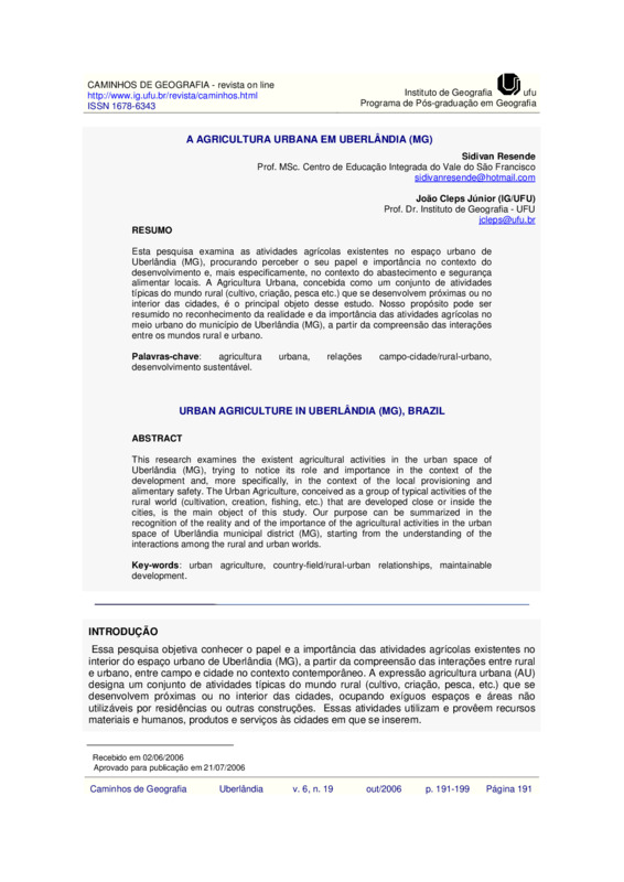 A agricultura urbana em Uberlândia (MG) / URBAN AGRICULTURE IN UBERLÂNDIA (MG), BRAZIL