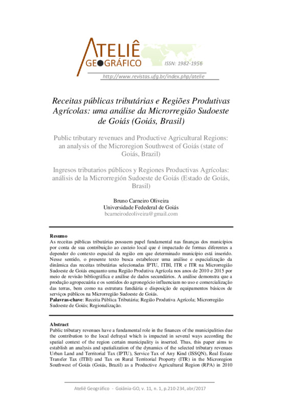 ResumoAs receitas públicas tributárias possuem papel fundamental nas finanças dos municípios por conta de sua contribuição ao custeio local que é impactado de formas diferentes a depender do contexto espacial da região em que determinado município está inserido. Nesse sentido, o presente texto busca estabelecer uma análise e espacialização da dinâmica das receitas tributárias selecionadas IPTU, ITBI, ITR e ITR na Microrregião Sudoeste de Goiás enquanto uma Região Produtiva Agrícola nos anos de 2010 e 2015 por meio de revisão bibliográfica e análise de dados secundários. A análise demonstra que a produção agropecuária e os sentidos do agronegócio influenciam no uso e comercialização das terras, bem como na estrutura fundiária e disposição de equipamentos básicos de serviços públicos na Microrregião Sudoeste de Goiás.. AbstractPublic tributary revenues have a fundamental role in the finances of the municipalities due the contribution to the local defrayal which is impacted in several ways according the spatial context of the region certain municipality is inserted. Thus, this paper aims to establish an analysis and spatialization of the dynamics of the selected tributary revenues Urban Land and Territorial Tax (IPTU), Service Tax of Any Kind (ISSQN), Real Estate Transfer Tax (ITBI) and Tax on Rural Territorial Property (ITR) in the Microregion Southwest of Goiás (Goiás, Brazil) as a Productive Agricultural Region (RPA) in 2010 and 2015 through a bibliographic review and secondary data analysis. The analysis shows that the agricultural and cattle raising production and the senses of agribusiness influence on the use and commercialization of land, as well as on the land structure and disposition of basic equipments of public services in the Microregion Southwest of Goiás.Keywords: Public tributary revenue; Productive Agricultural Region; Microregion Southwest of Goiás; Regionalization. ResumenLos ingresos tributarios públicos tienen un papel fundamental en las finanzas de los municipios debido a la contribución a la afluencia local que se ve afectada de varias maneras según el contexto espacial de la región que se inserta cierto municipio. Por lo tanto, este trabajo tiene como objetivo establecer un análisis y espacialización de la dinámica de los ingresos tributarios seleccionados Impuesto Territorial y Territorial (IPTU), Impuesto de Servicios de Cualquier Clase (ISSQN), Impuesto de Transmisiones Inmobiliarias (ITBI) e Impuesto a la Propiedad Territorial Rural (ITR) en el Microrregión Sudoeste de Goiás (Goiás, Brasil) como Región Agrícola Productiva (RPA) en 2010 y 2015 mediante una revisión bibliográfica y un análisis de datos secundarios. El análisis muestra que la producción agrícola y ganadera y los sentidos de la agroindustria influyen en el uso y comercialización de la tierra, así como en la estructura de la tierra y disposición de los equipos básicos de servicios públicos en la Microrregión Suroeste de Goiás.Palabras clave: Ingresos Públicos Tributarios; Región Productiva Agrícola; Microrregión Sudoeste de Goiás; Regionalización.