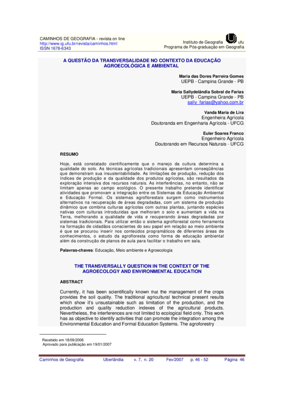 A QUESTÃO DA TRANSVERSALIDADE NO CONTEXTO DA EDUCAÇÃO AGROECOLÓGICA E AMBIENTAL / The transversally question in the context of the agroecology and environmental education