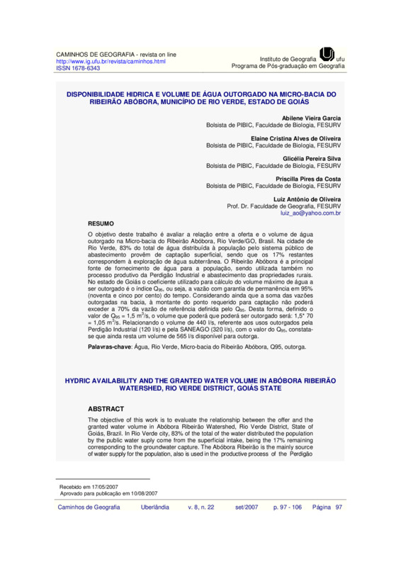 Disponibilidade hídrica e volume de água outorgado na micro-bacia do Ribeirão Abóbora, Município de Rio Verde, Estado de Goiás / Hydric availability and the granted water volume in abóbora ribeirão watershed, Rio Verde District, Goiás State