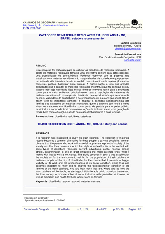 Coletadores de resíduos sólidos em Uberlândia - MG/Brasil: estudo e recenseamento