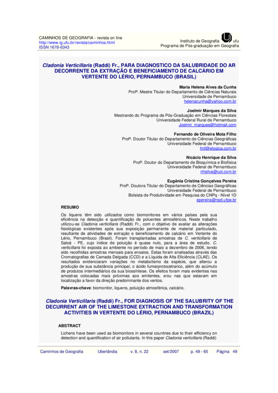 Cladonia verticillaris (raddi) fr., para diagnostico da salubridade do ar decorrente da extração e beneficiamento de calcário em Vertente do Lério, Pernambuco (Brasil) / Cladonia Verticillaris (Raddi) Fr., for diagnosis of the salubrity of the decurrent air of the limestone extraction and transformation activities in Vertente do Lério, Pernambuco (Brazil)