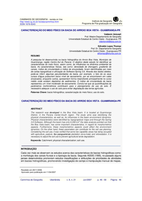 A pesquisa foi desenvolvida na bacia hidrográfica do Arroio Boa Vista, Município de Guamiranga, região Centro-Sul do Paraná. O objetivo deste estudo foi identificar as características do meio físico, assim como, às influências na dinâmica ambiental da bacia. As características físicas, tais como: densidade de drenagem, gradiente de canais, índice de circularidade e índice de sinuosidade, foram identificadas por meio de cartas topográficas e utilização do Software Spring 3.6. Através dos dados obtidos, pode-se inferir algumas peculiaridades da bacia, por exemplo, o fato de os seus cursos d'água possuírem baixo nível de escoamento, por se encontrarem em vales encaixados, enquanto outros, apresentam forma meandrante principalmente no curso médio onde existem depósitos de sedimentos. O índice de circularidade da bacia representou um nível moderado de escoamento. Conclui-se que as quantificações de parâmetros morfométricos contribuem para o planejamento de uso do solo. É necessário adequar o uso do solo para evitar degradação das terras agrícolas.