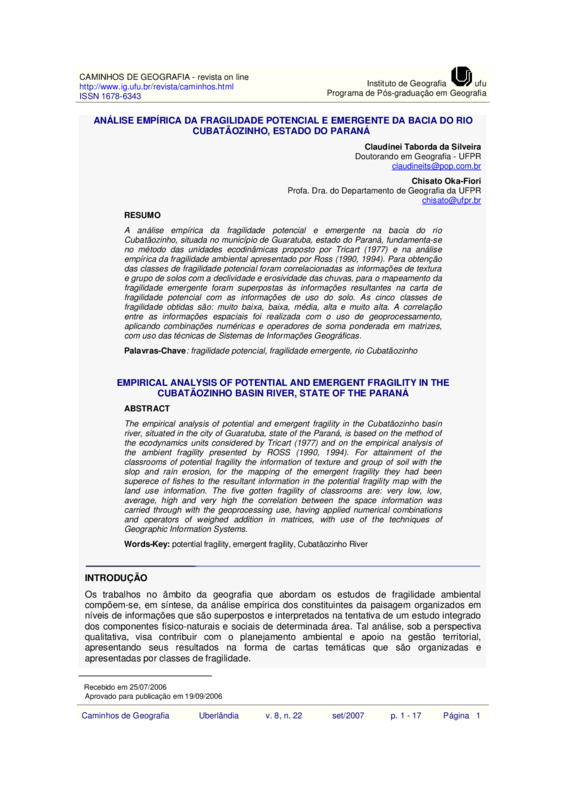 Análise empírica da fragilidade ambiental da bacia do rio Cubatãozinho, Estado do Paraná / Empirical analysis of potential and emergent fragility in the Cubatãozinho basin river, State of the Paraná