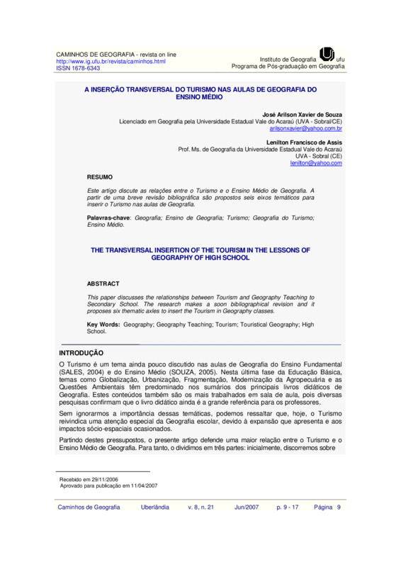 Palavras-chave: Geografia; Ensino de Geografia; Turismo; Geografia do Turismo; Ensino Médio.