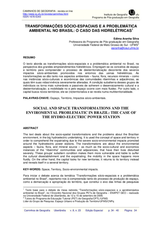 O texto aborda as transformações sócio-espaciais e a problemática ambiental no Brasil, na perspectiva dos grandes empreendimentos hidrelétricos. Empregam-se os conceitos de espaço e território para compreender o processo de desterritorialização decorrente dos severos impactos sócio-ambientais promovidos nos entornos das usinas hidrelétricas. As transformações se dão tanto nos aspectos ambientais – fauna, flora, recursos minerais – como nas instâncias sócio-culturais e econômicas das comunidades ribeirinhas e adjacências, as quais têm suas vidas/vivência severamente alteradas. A condição subalterna desses grupos de indivíduos os torna mais vulneráveis e passíveis de sofrerem o desenraizamento cultural e a desterritorialização; a mobilidade no e pelo espaço ocorre com mais fluidez. Por outro lado, o capital busca novos territórios; ele se (re)territorializa e se revela numa multiterritorialdiade.