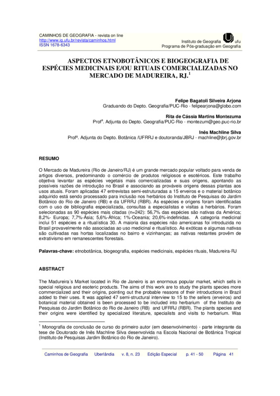 O Mercado de Madureira (Rio de Janeiro/RJ) é um grande mercado popular voltado para venda de artigos diversos, predominando o comércio de produtos religiosos e esotéricos. Este trabalho objetiva levantar as espécies vegetais mais comercializadas e suas origens, apontando as possíveis razões de introdução no Brasil e associando as prováveis origens dessas plantas aos usos atuais. Foram aplicadas 47 entrevistas semi-estruturadas a 15 erveiros e o material botânico adquirido está sendo processado para inclusão nos herbários do Instituto de Pesquisas do Jardim Botânico do Rio de Janeiro (RB) e da UFRRJ (RBR). As espécies e origens foram identificadas com o uso de bibliografia especializada, consultas a especialistas e visitas a herbários. Foram selecionadas as 90 espécies mais citadas (n=242): 56,7% das espécies são nativas da América; 8,2%- Europa; 7,7%-sia; 5,6%-frica; 1%-Oceania; 20,6%-indefinidas. A categoria medicinal inclui 51 espécies e a ritualística 30. A maioria das espécies não americanas foi introduzida no Brasil provavelmente não associadas ao uso medicinal e ritualístico. As exóticas e algumas nativas são cultivadas nas hortas localizadas no bairro e vizinhanças; as nativas restantes provêm de extrativismo em remanescentes florestais.