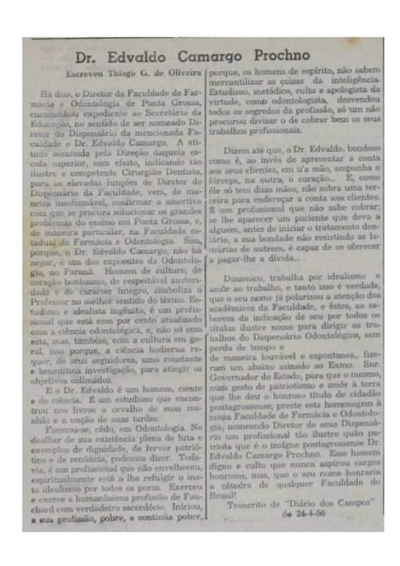 - Dr. Edvaldo Camargo Prochno. Sobre o indicado para Diretor da Faculdade de Farmácia e Odontologia