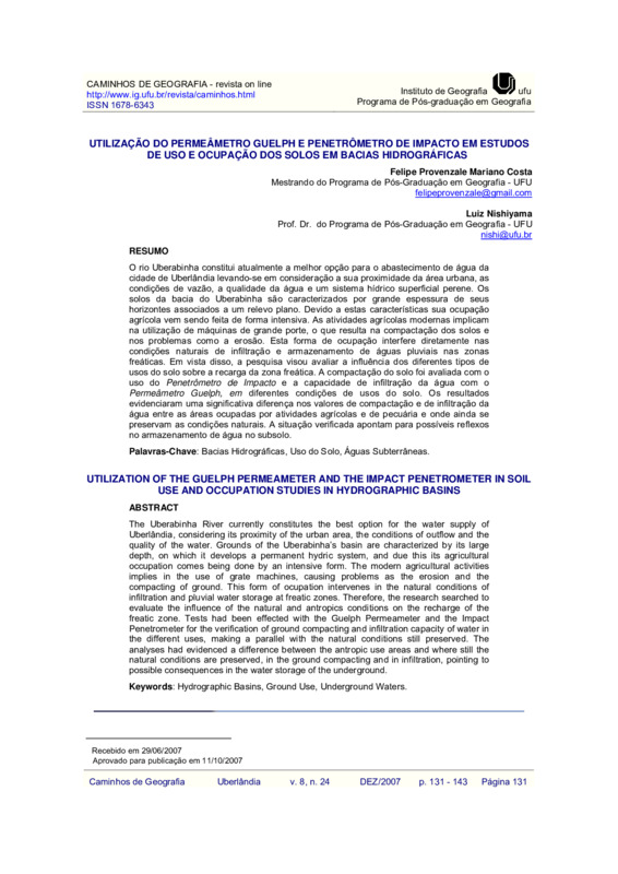 O rio Uberabinha constitui atualmente a melhor opção para o abastecimento de água da cidade de Uberlândia levando-se em consideração a sua proximidade da área urbana, as condições de vazão, a qualidade da água e um sistema hídrico superficial perene. Os solos da bacia do Uberabinha são caracterizados por grande espessura de seus horizontes associados a um relevo plano. Devido a estas características sua ocupação agrícola vem sendo feita de forma intensiva. As atividades agrícolas modernas implicam na utilização de máquinas de grande porte, o que resulta na compactação dos solos e nos problemas como a erosão. Esta forma de ocupação interfere diretamente nas condições naturais de infiltração e armazenamento de águas pluviais nas zonas freáticas. Em vista disso, a pesquisa visou avaliar a influência dos diferentes tipos de usos do solo sobre a recarga da zona freática. A compactação do solo foi avaliada com o uso do Penetrômetro de Impacto e a capacidade de infiltração da água com o Permeâmetro Guelph, em diferentes condições de usos do solo. Os resultados evidenciaram uma significativa diferença nos valores de compactação e de infiltração da água entre as áreas ocupadas por atividades agrícolas e de pecuária e onde ainda se preservam as condições naturais. A situação verificada apontam para possíveis reflexos no armazenamento de água no subsolo.