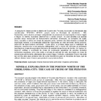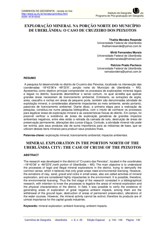 A pesquisa foi desenvolvida no distrito de Cruzeiro dos Peixotos, localizado na intersecção das coordenadas -18°43’36e -48°22’6, porção norte do Município de Uberlândia – MG. Apresentou como objetivo principal compreender os processos de explorações minerais legais e ilegais no distrito, buscando desmistificar o senso comum, no qual acredita que apenas grandes áreas necessitam de licenciamento ambiental. Entretanto, as extrações de argila, areia, cascalho e rochas em áreas de pequeno porte, também são denominadas atividade de explotação mineral, e consideradas altamente impactantes ao meio ambiente, sendo portanto, passíveis de licenciamento ambiental. Diante disso, a primeira etapa para a realização da pesquisa, constituiu-se numa pesquisa bibliográfica, com o intuito de conhecer os processos para legalizar áreas de exploração mineral e as características físicas do distrito. Em campo, foi possível verificar a existência de áreas de exploração geradoras de grandes impactos ambientais negativos, entre eles estão a retirada da camada de solo, destruição de áreas de preservação permanente, alterações dos cursos d’água. Contudo, a atividade mineral não pode ser extinta, pois seus produtos são de suma importância para as indústrias de base, que se utilizam desses bens minerais para produzir seus produtos finais.
