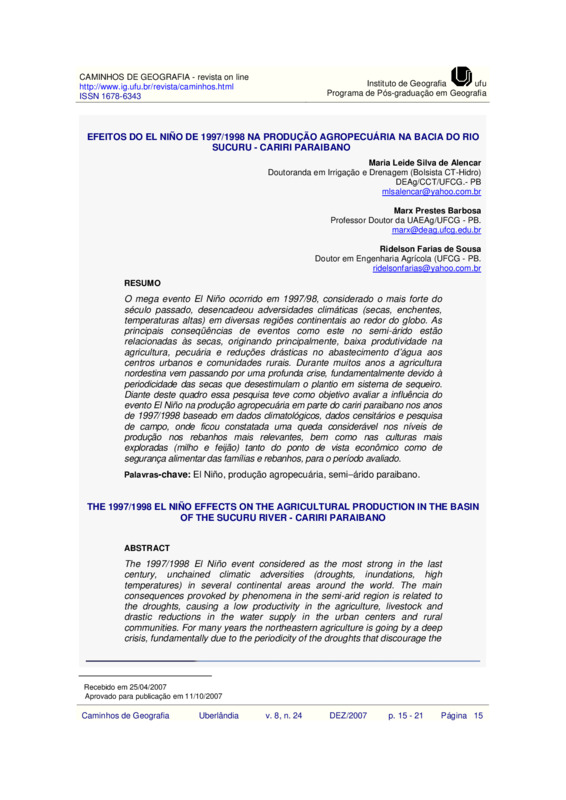 O mega evento El Niño ocorrido em 1997/98, considerado o mais forte do século passado, desencadeou adversidades climáticas (secas, enchentes, temperaturas altas) em diversas regiões continentais ao redor do globo. As principais conseqüências de eventos como este no semi-árido estão relacionadas às secas, originando principalmente, baixa produtividade na agricultura, pecuária e reduções drásticas no abastecimento d’água aos centros urbanos e comunidades rurais. Durante muitos anos a agricultura nordestina vem passando por uma profunda crise, fundamentalmente devido à periodicidade das secas que desestimulam o plantio em sistema de sequeiro. Diante deste quadro essa pesquisa teve como objetivo avaliar a influência do evento El Niño na produção agropecuária em parte do cariri paraibano nos anos de 1997/1998 baseado em dados climatológicos, dados censitários e pesquisa de campo, onde ficou constatada uma queda considerável nos níveis de produção nos rebanhos mais relevantes, bem como nas culturas mais exploradas (milho e feijão) tanto do ponto de vista econômico como de segurança alimentar das famílias e rebanhos, para o período avaliado.