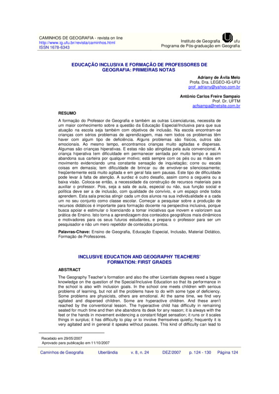 A formação do Professor de Geografia e também as outras Licenciaturas, necessita de um maior conhecimento sobre a questão da Educação Especial/Inclusiva para que sua atuação na escola seja também com objetivos de inclusão. Na escola encontram-se crianças com sérios problemas de aprendizagem, mas nem todos os problemas têm haver com algum tipo de deficiência. Alguns problemas são físicos, outros são emocionais. Ao mesmo tempo, encontramos crianças muito agitadas e dispersas. Algumas são crianças hiperativas. E estas não são atingidas pela aula convencional. A criança hiperativa tem dificuldade em permanecer sentada por muito tempo e assim abandona sua carteira por qualquer motivo; está sempre com os pés ou as mãos em movimento evidenciando uma constante sensação de inquietação; corre ou escala coisas em demasia; tem dificuldade de brincar ou de envolver-se silenciosamente; freqüentemente está muito agitada e em geral fala sem pausas. Este tipo de dificuldade pode levar à falta de atenção. A surdez é outro desafio, assim como a cegueira ou a baixa visão. Coloca-se então, a necessidade da construção de recursos materiais para auxiliar o professor. Pois, seja a sala de aula, especial ou não, sua função social e política deve ser a de inclusão, com qualidade de convívio, e um espaço onde todos aprendem. Esta sala precisa atingir cada um dos alunos na sua individualidade e a cada um no seu conjunto como classe escolar. Começar a pesquisar sobre a produção de recursos didáticos é importante para formação docente na perspectiva inclusiva, porque busca apoiar e estimular o licenciando a tomar iniciativas que inovem e valorizem sua prática de Ensino. Isto torna a aprendizagem dos conteúdos geográficos mais dinâmicos e motivadores para os seus futuros estudantes, e prepara o professor para ser um pesquisador e não um mero repetidor de conteúdos prontos.